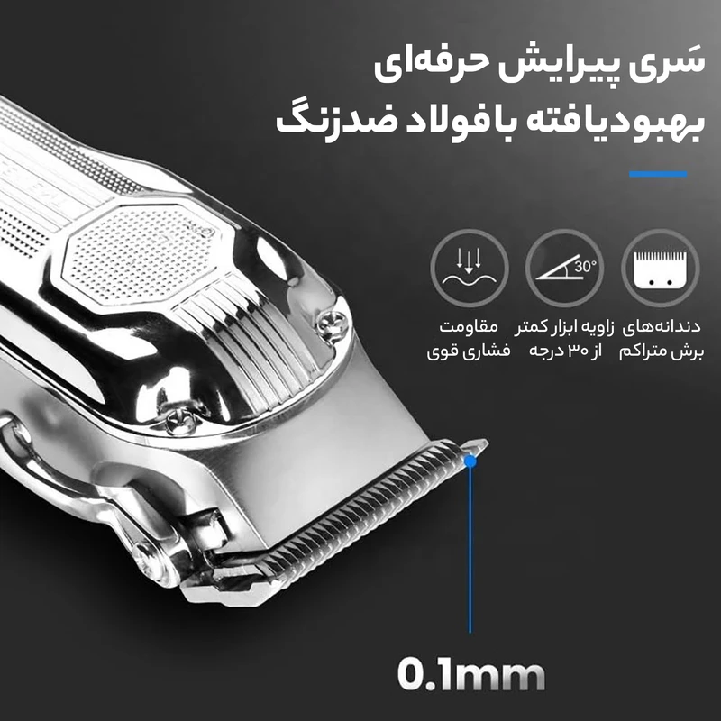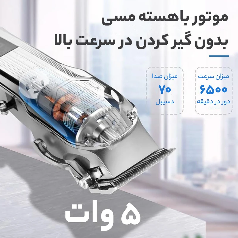 ماشین اصلاح حرفه ای کیمی مدل Km-517 با بدنه فلزی و تیغه استیل ضد زنگ یکی از جدیدترین و با کیفیت ترین ماشین اصلاح های موجود در بازار است. نمایشگر LED این ماشین اصلاح، میزان شارژ دستگاه و همینطور یادآوری زمان روغن کاری و شارژ آن را نشان می دهد. از موتوری با قدرت 6500 دور و باتری لیتیومی 2000 میلی آمپری بهره می برد. مدت زمان شارژ کامل آن 2 ساعت و مدت زمان استفاده اش 200 دقیقه است. از این ماشین اصلاح میتوان برای حجم زنی فید و سایه زنی استفاده کرد و همچنین اندازه اصلاح با تعویض شانه هایش قابل تغییر است.